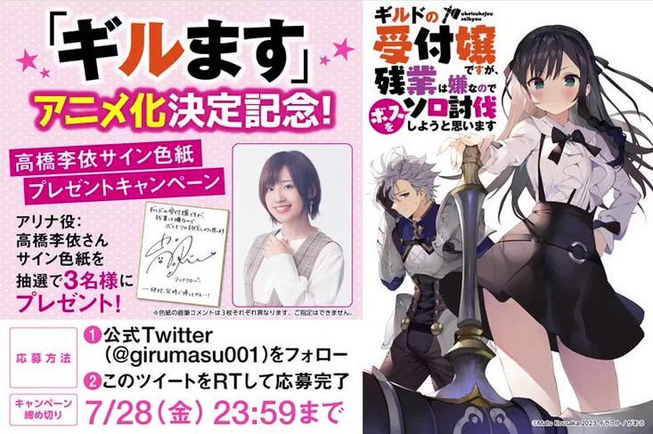 为纪念电视动画化,目前于官方推特正在实施跟随官方推特并转推指定贴文,即可抽选 3 名粉丝获得饰演 亚莉纳的高桥李依亲笔签名色纸。
